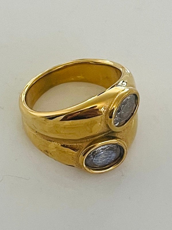 "Double your style game with our Doble clear Gold ring. This playful piece will bring some shine to your wardrobe, without taking yourself too seriously."
