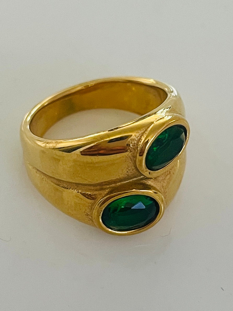 "Add double the charm to your style with our Doble green Gold ring. This unique piece features a playful combination of green and gold, giving your outfit a fun and quirky touch. Make a statement with this must-have accessory!"