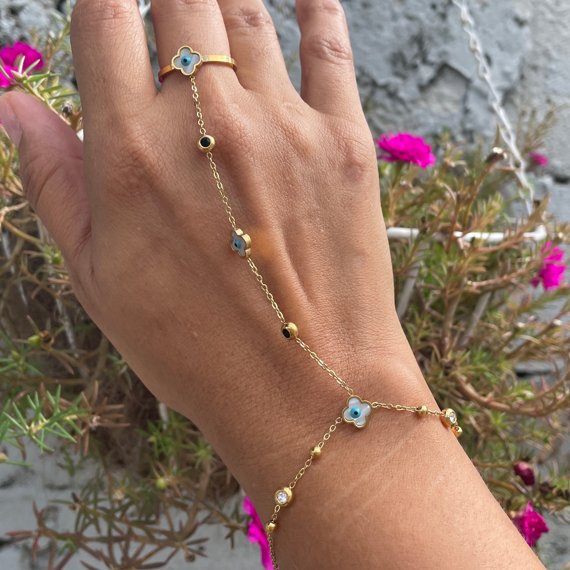 "Are you ready for a killer vacation? Then grab this evil eye ring bracelet and ward off any bad vibes while looking fabulous. Perfect for adding some edgy style to your beach or city adventures. Don't let the evil eye hold you back. (No pun intended.)"